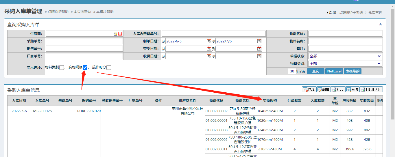 [点晴模切ERP]采购入库单上的信息能显示出实际的入库规格么