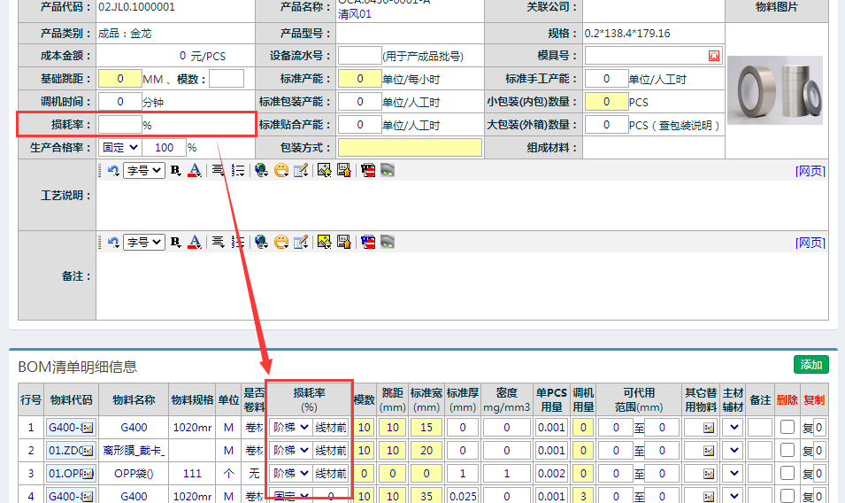 如果下面的明细原物料不单独设置,那么原物料损耗率统一取上面的损耗率,否则以各个原物料单独设置的损耗率为准。