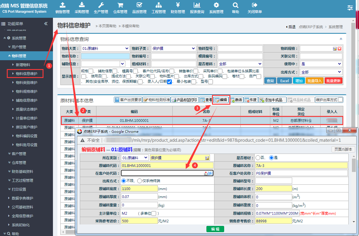 ![]() ![]() 进入点晴ERP-》系统管理-》物料管理-》物料信息维护: