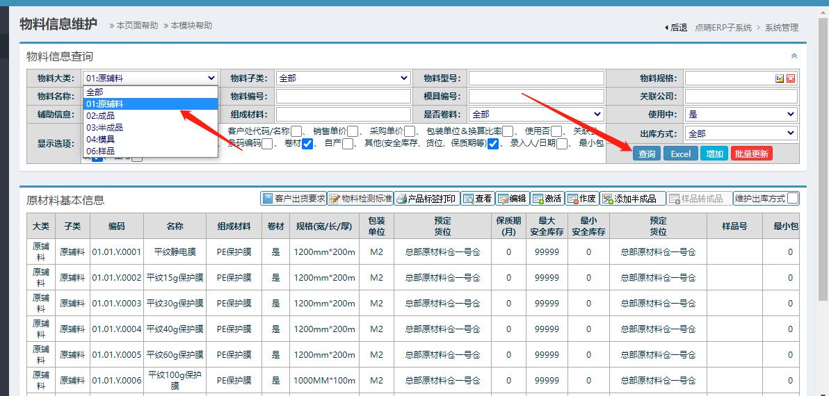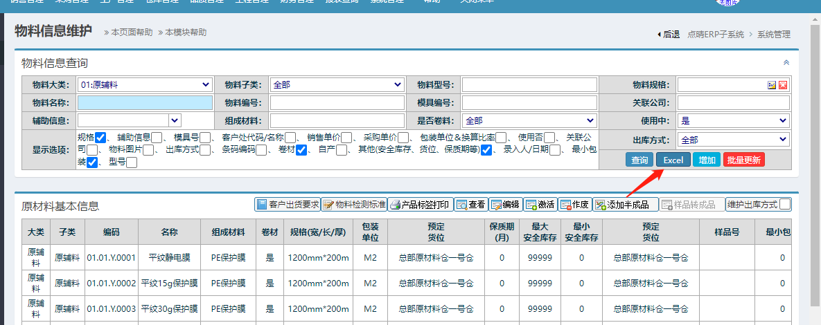 点晴模切ERP如何批量导出原材料或成品基础资料