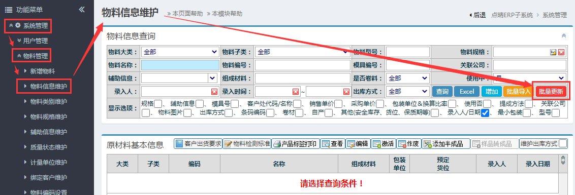 ![]() 1、进入ERP系统-》系统管理-》物料管理-》物料信息维护,点击按钮“批量更新”: