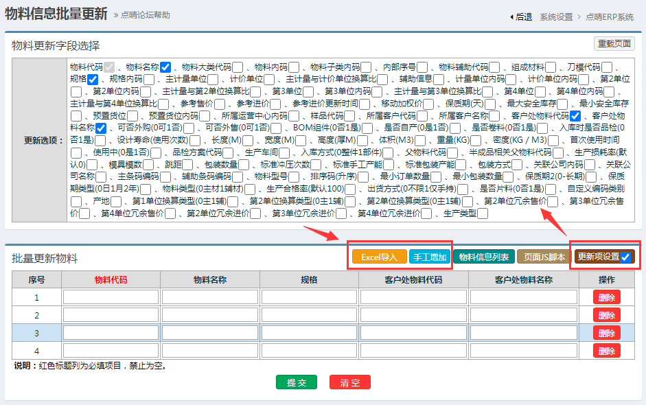 点晴模切ERP是否支持批量更新系统中现有物料的规格/型号/保质期/重量/体积/长/宽/高/预置货位等基础信息?要如何设置和操作?