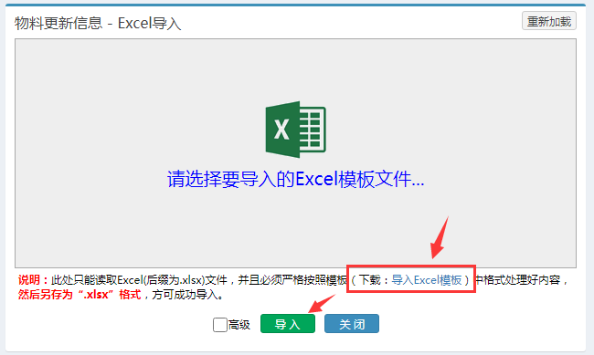 ![]() 3、更新物料基础信息,可以是手工增加物料信息,也可以是Excel导入,点击按钮“Excel导入”,弹出如下界面: