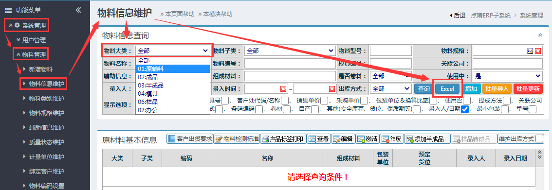 请问点晴模切ERP中的成品/原材料/半成品/模具等物料基础信息在哪里可以批量导出到Excel文件中?