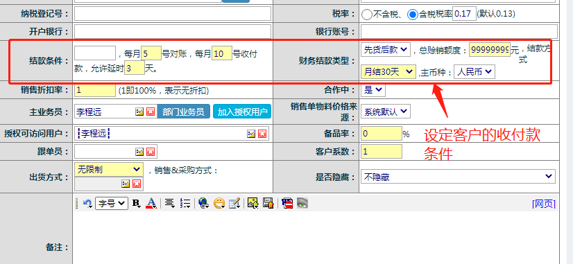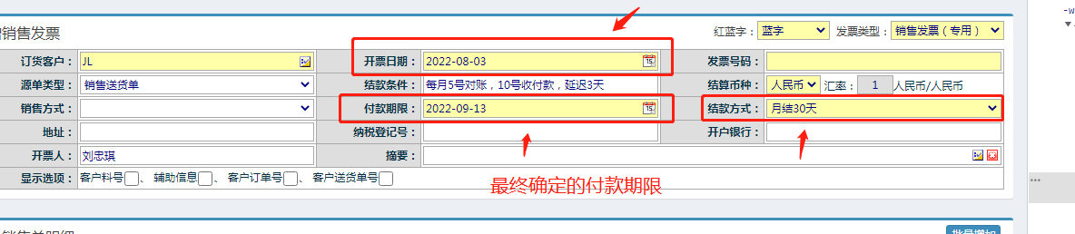 新增发票时,选择客户及开票日期后,系统会根据客户的结款条件自动设定最终的付款期限,本期限也可以手工修改。