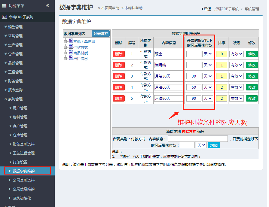 在数据字典的收付款类型中,设定每种收付款类型的收款天数。
