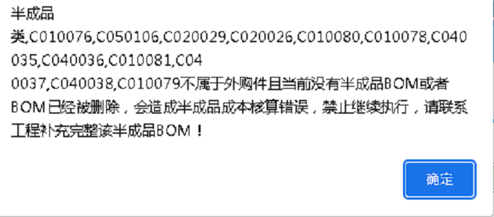 [点晴模切ERP]提示以下物料不属于外购件且当前没有半成品BOM或BOM已被删除,导致核算错误,禁止执行