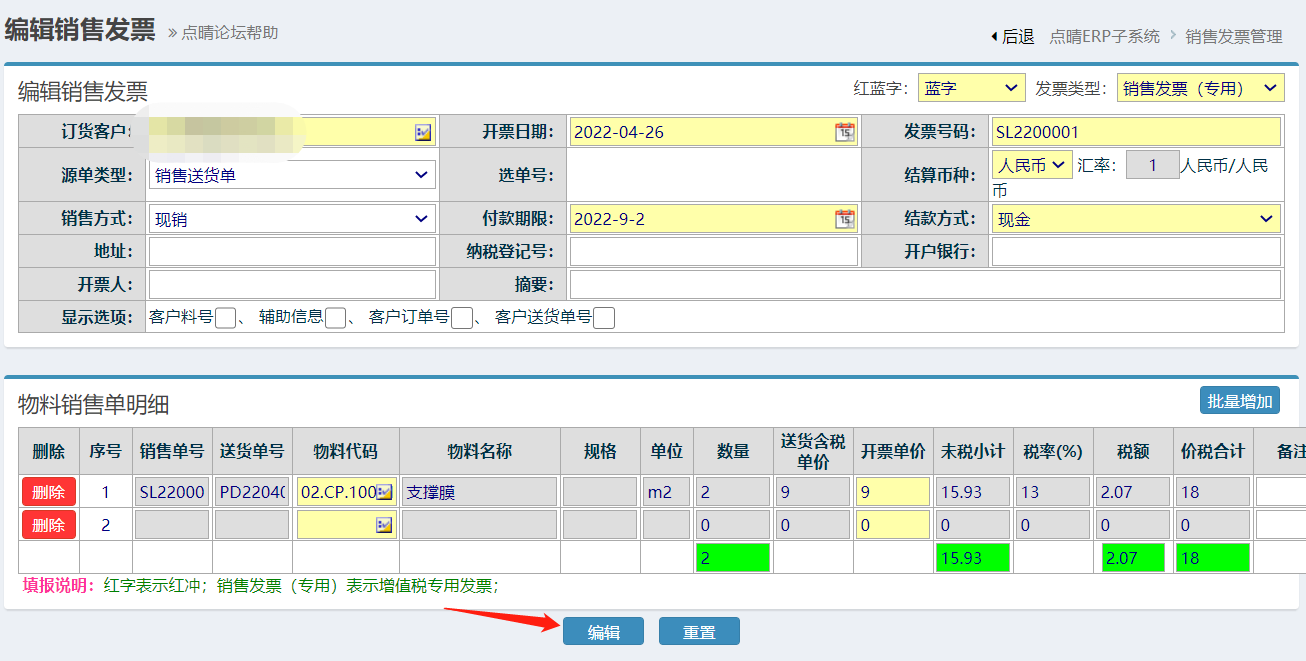点晴模切ERP发票管理-如何编辑发票信息