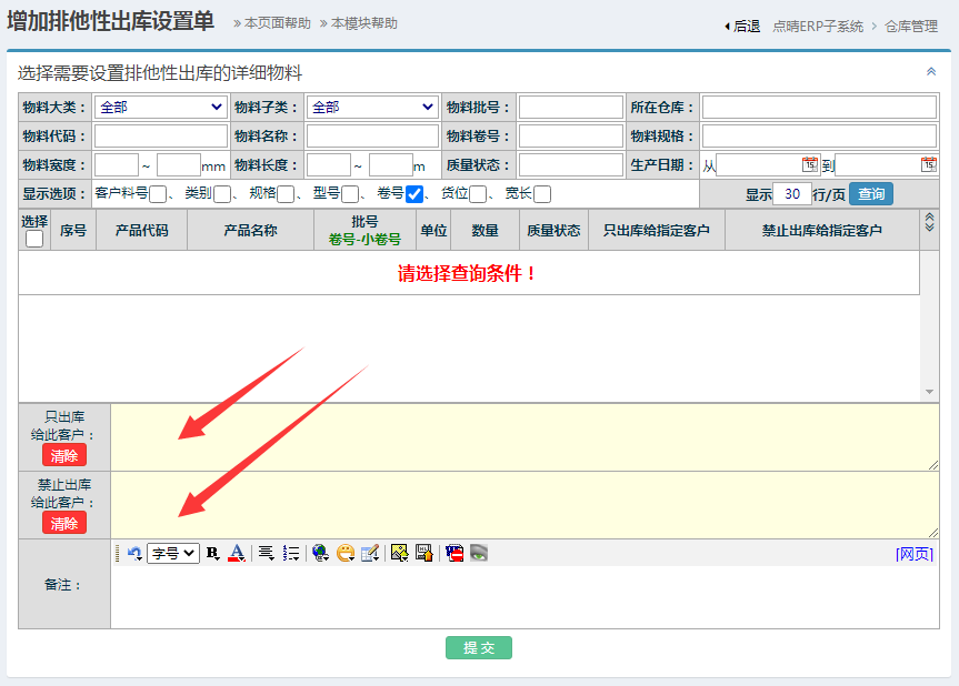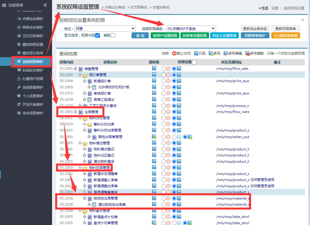 设置位置:系统权限维护设置-》05:点晴ERP子系统-》仓库管理-》物料在库管理-》排他性出库管理