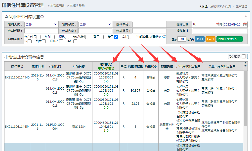 针对部分客户提出的库存物料定向供应需求,点晴ERP提供了物料排他性出库设置功能,可以指定某个批号的物料只能出库给指定单位或不能出库给指定单位,设置方法如下: