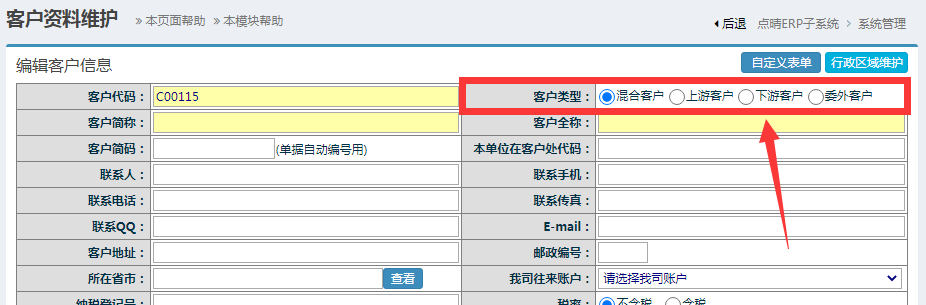 :请问点晴ERP中创建客户资料时的上游、下游、混合和委外客户分别指什么?![]() 上游客户:就是传统意义上的供应商,供应物料给本单位的客户;