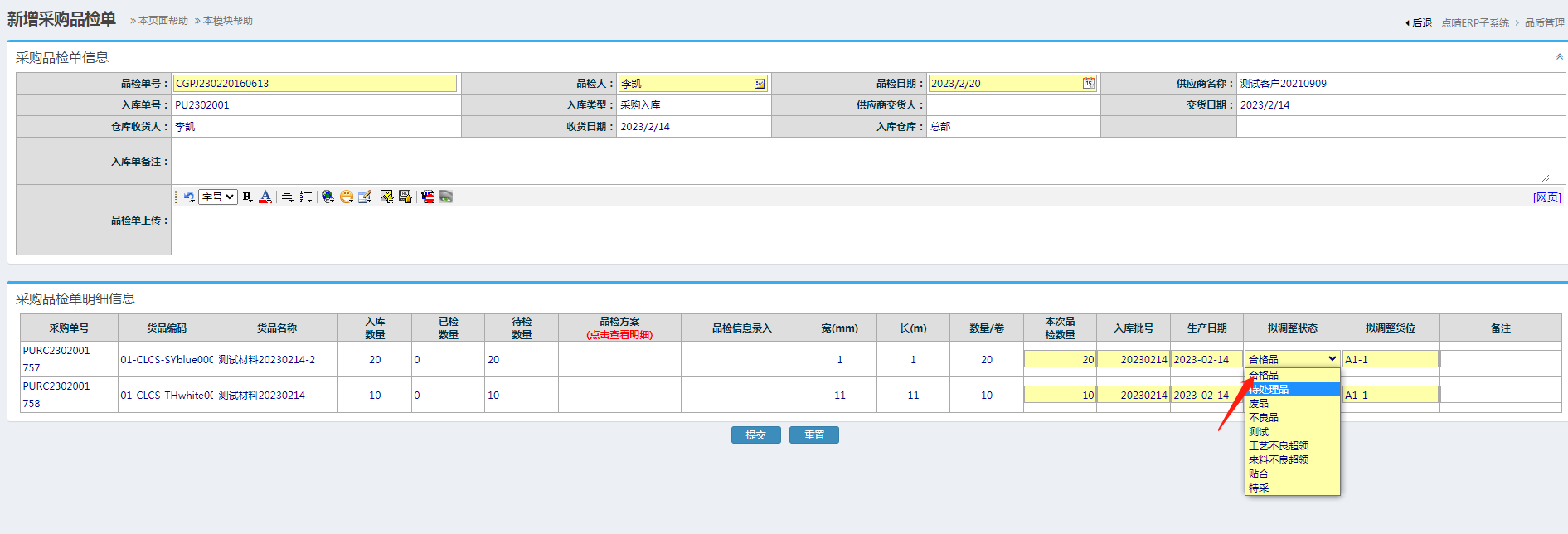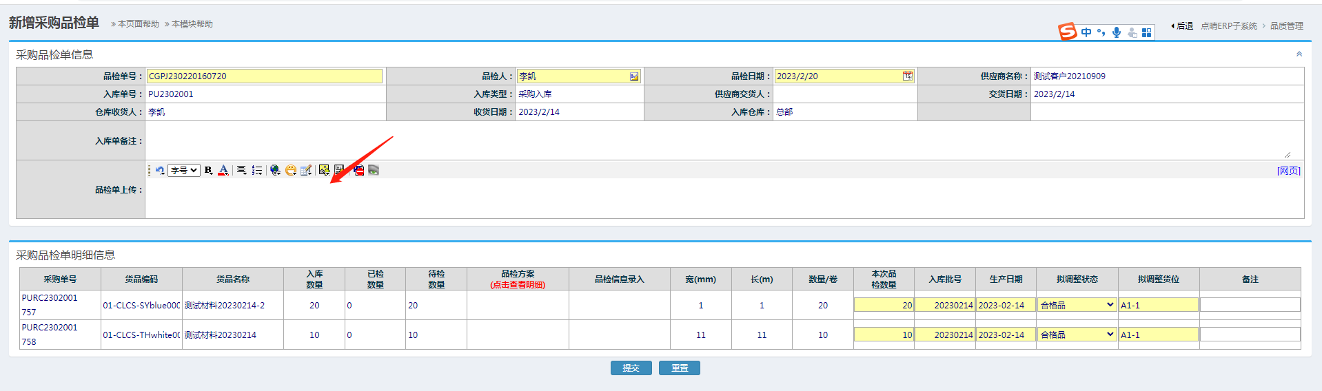 设置对应的品质状态,也能上传对应的品质表格、图片等信息