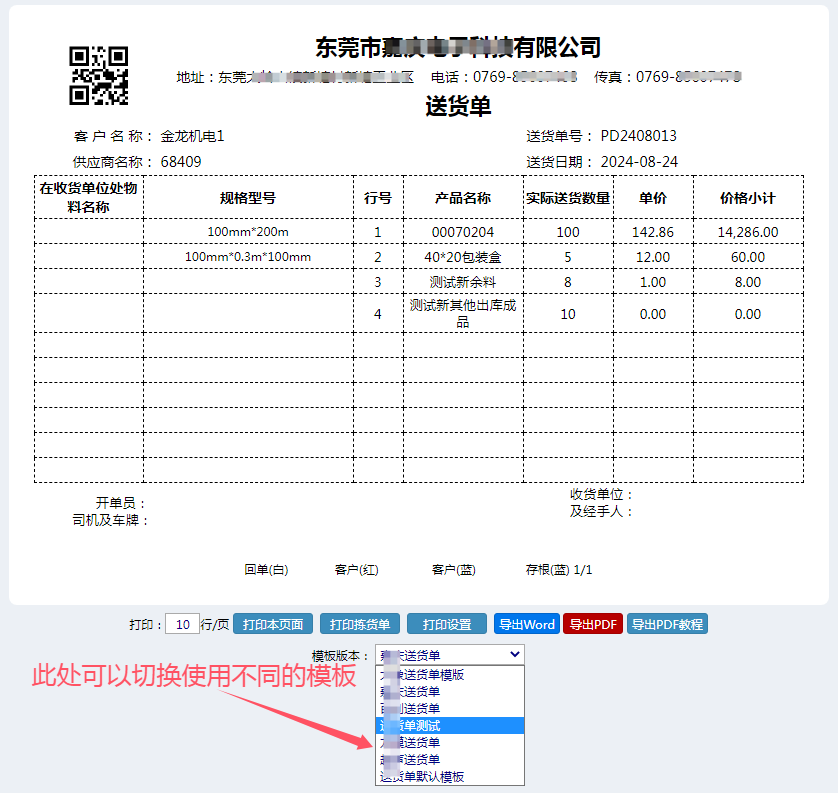 按照以上将单据模板设计完毕后,就可以在单据打印界面上显示可以使用的模板了: 点晴模切ERP更多信息:http://moqie.clicksun.cn,联系电话:4001861886 该文章在 2024/9/25 11:35:42 编辑过 |