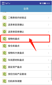 ![]() 打开点晴业务通APP,点击‘按物料盘点’菜单进入