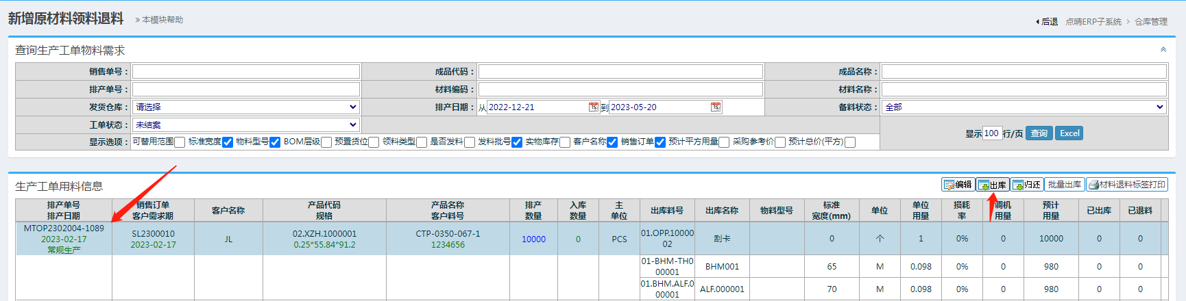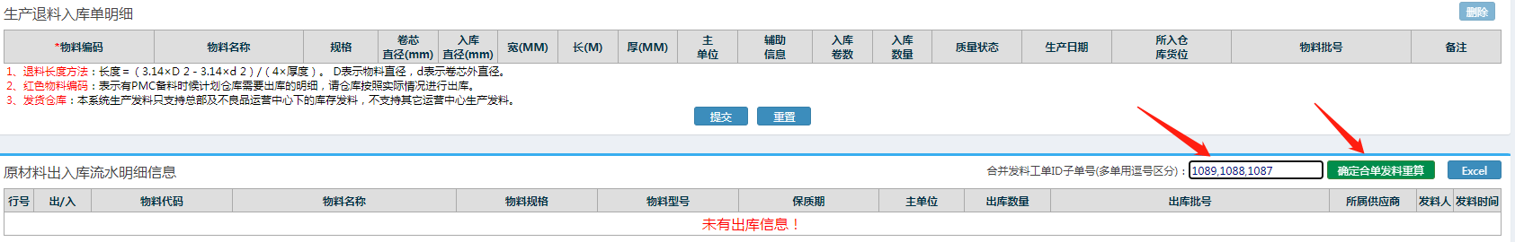 仓库管理-物料出库管理-生产领料出库-新增领料出库单 进入界面后,选择其中的一个单号,点击出库按钮 进入界面后,输入对应的子单号并且用逗号隔开,(注意逗号要英文输入法逗号),点击确定合并发料重算按钮 点晴模切ERP更多信息:http://moqie.clicksun.cn,联系电话:4001861886 该文章在 2023/3/21 17:41:10 编辑过 |