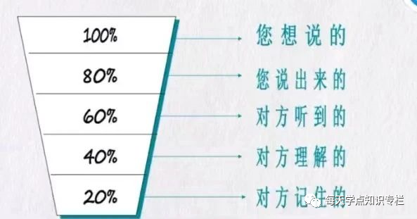 在沟通中,你心里所想的100%,他人行动时却只有20%,我们心里要说的话,为什么会层层漏掉? 第一个漏掉的20%(你心里说的100%,你嘴上说的80%)原因是: 1、没有记住重点;2、不好意思讲。 解决办法:写下要点;请别人代讲。 第二个漏掉的20%(你嘴上说的80%,别人听到的60%)原因是: 1、你自己在讲话时有干扰;2、他人在听话时有干扰;3、没有笔记。 解决办法:避免干扰;记笔记。 第三个漏掉的20%(别人听到的60%,别人听懂的40%)原因是: 不懂装懂。 解决办法:质问;问他有没有其他想法。 第四个漏掉的20%(别人听懂的40%,别人行动的20%)原因是: 1、没有办法;2、缺少监督。
