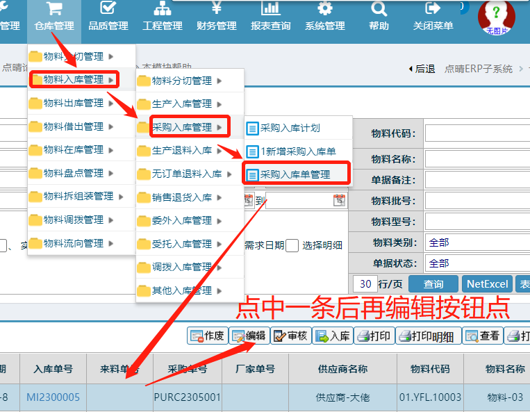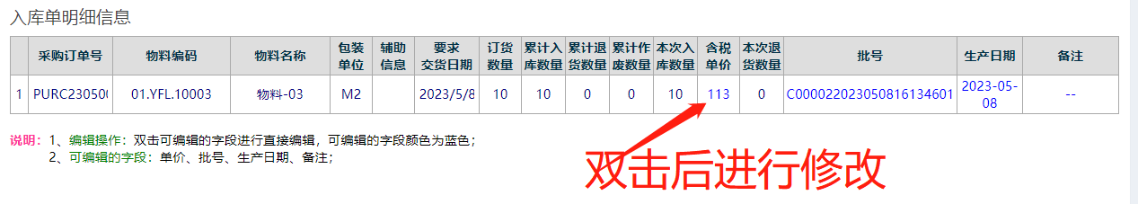 ![]() ![]() 进入采购入库单管理,点中一条后再点编辑按钮,如下图: 双击单价后,会出现输入框后,直接修改: 修改完后,鼠标点一下其他位置,不再聚焦这里即可保存。 点晴模切ERP更多信息:http://moqie.clicksun.cn,联系电话:4001861886 该文章在 2025/4/17 14:23:49 编辑过 |