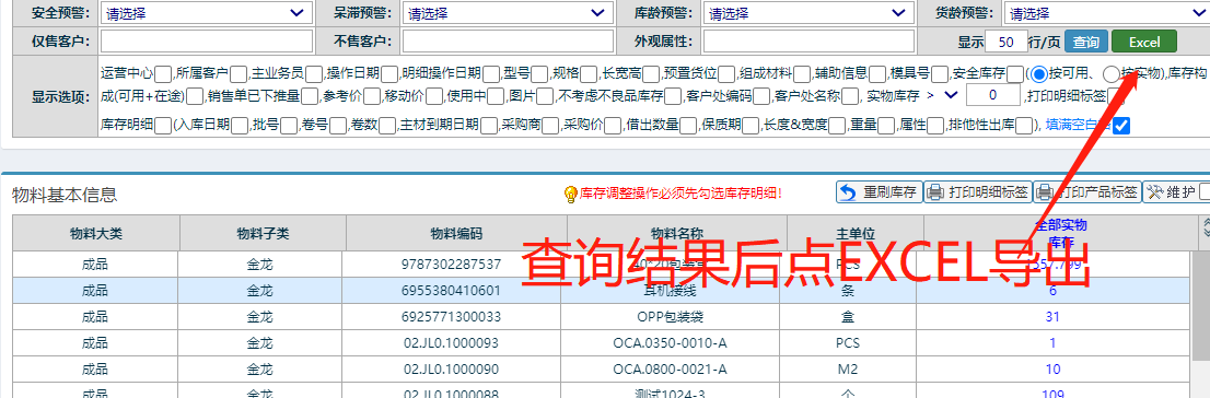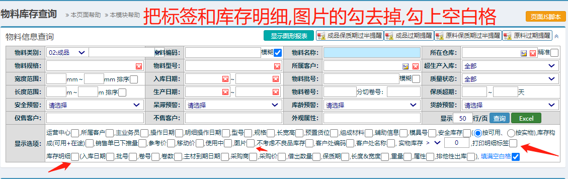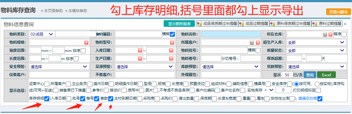 ![]() 点击进入物料库存查询 如下图: 第一种不按明细导出库存信息,可以导出一个总数库存,一个物料一个总库存 操作方法:把库存明细,明细标签,图片的勾去掉,勾上空白格,然后点击查询 如下图: 查询出结果后点EXCEL进行导出。 如下图: 第二种按库存明细导出,每一行是一个明细库存,一行一个批号,卷号的库存明细,系统按批号卷号来管理库存的 勾上库存明细,要导出的明细项勾上即可,然后查询出结果后点EXCEL 键导出 点晴模切ERP更多信息:http://moqie.clicksun.cn,联系电话:4001861886 该文章在 2025/5/22 10:30:34 编辑过 |