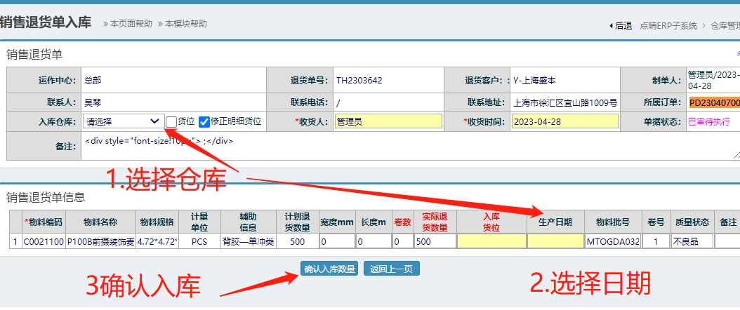 ![]() ![]() 情况描述:送货单驳回操作时弹出提示:该送货单属于异常回单,系统已经生成退货单,请先作废或者结案对应的退货单!如何解决。 原因:该送货单有退货的记录,但没有完成退货入库。 所以首先将该笔退货入库先,进入退料单管理,点中该条信息后,点击新增退货入库。 如下图: 然后,选择仓库,日期,最后确认入库即可。 如下图: 操作完后才能该送货单重新驳回结案。