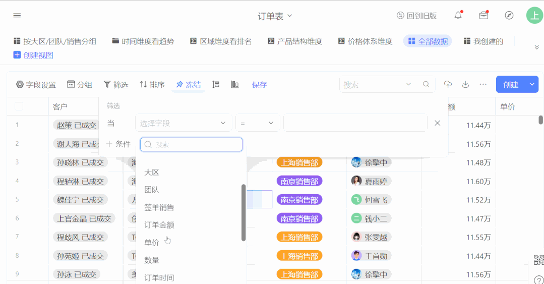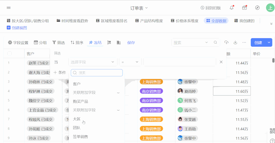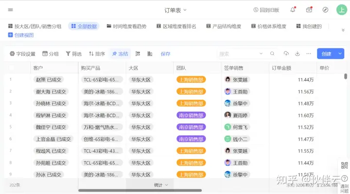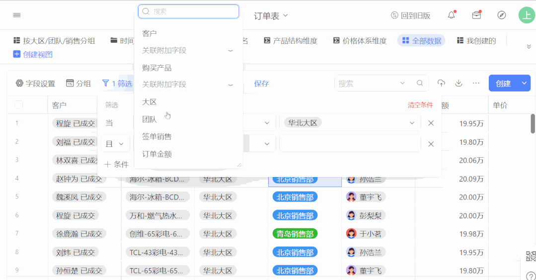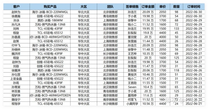 选择想要查看的大区、销售团队,即可筛选出对应订单明细: