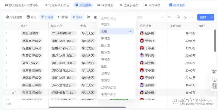 ▲筛选 大区 业绩明细▲筛选 团队 业绩明细筛选出来的数据在表格底部可以看到整体的数据情况,包括数值总和、平均值、最大值、最小值等。