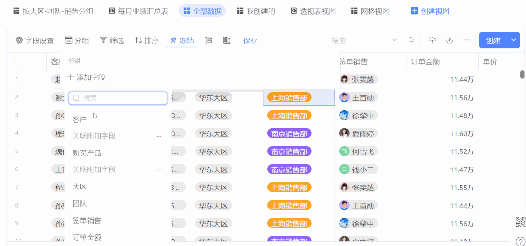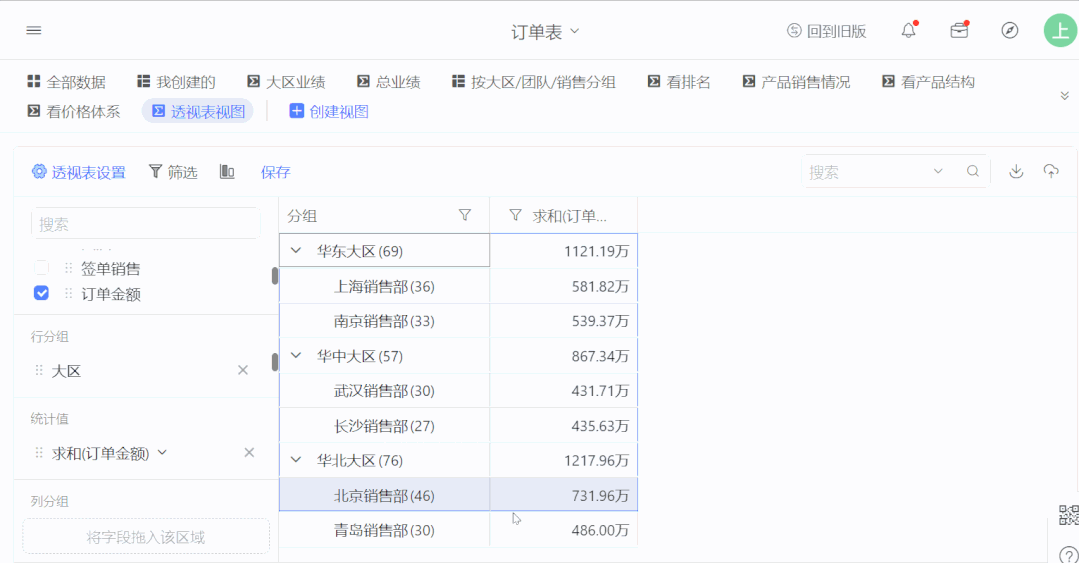 如将大区、团队拖拽到行分组中,将订单金额拖拽到统计值中,即按大区、团队看本月订单金额: