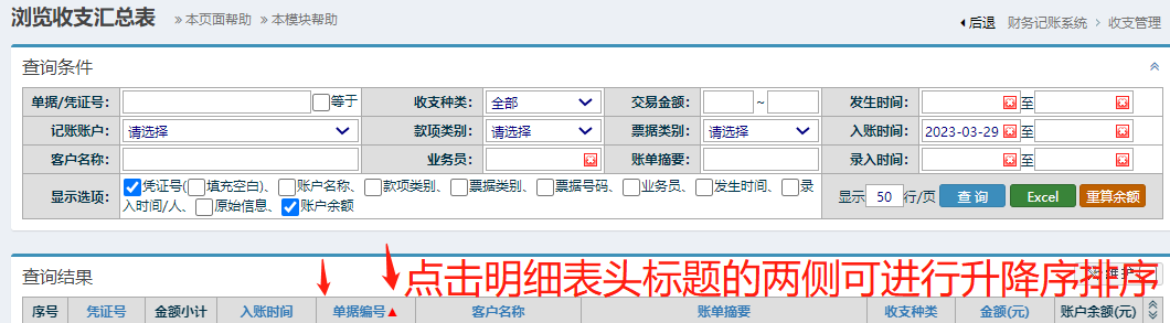 点晴模切ERP-财务管理查询界面按某一标题信息进行升降排序
