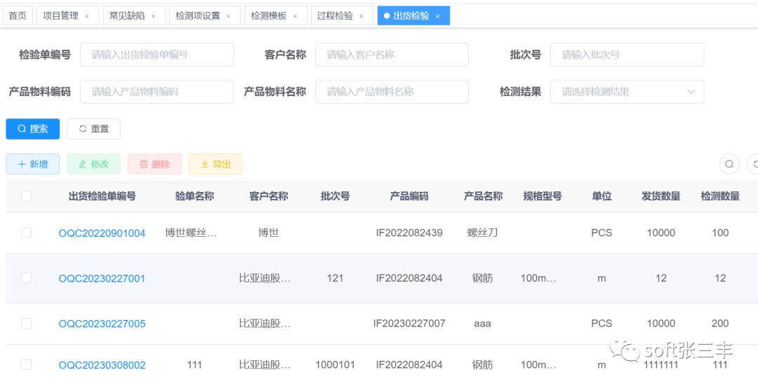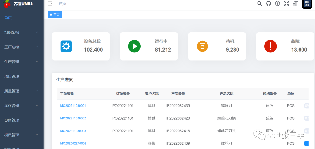 B/S结构 B/S结构是指浏览器/服务器结构(Browser/Server Structure),也称为客户端/服务器结构(Client/Server Structure)。这种结构是一种分布式计算模式,其中浏览器作为客户端,服务器作为服务端,客户端通过浏览器向服务器发送请求,并接收服务器返回的数据。B/S结构相对于C/S结构(Client/Server Structure),具有更好的可移植性和易于维护的优点,因为它将应用程序的逻辑控制从客户端转移到服务器端,客户端只需要一个浏览器即可访问应用程序,而无需安装其他软件。常见的B/S应用程序包括网上银行、电子商务、在线教育等。 MES系统 MES系统(Manufacturing execution System)是一种用于管理生产过程的计算机系统。它主要用于实时监测和控制生产过程中的各种工艺参数和设备状态,以确保生产线的高效运作和质量控制。MES系统通常与ERP系统(企业资源计划系统)和PLC系统(可编程逻辑控制器系统)等其他生产管理系统集成使用,以实现全面的生产管理和优化。 项目介绍苦糖果MES系统是一款B/S结构、开源、免费的生产执行管理系统。 主要目的是为国内离散制造业的中小企业提供一个专业化、通用性、低成本的MES系统解决方案。 系统将提供“售前”、“实施”、“用户培训”、“运维”等多个阶段的指导文档和教学视频,以帮助非IT专业人士顺利完成MES项目的实施应用。