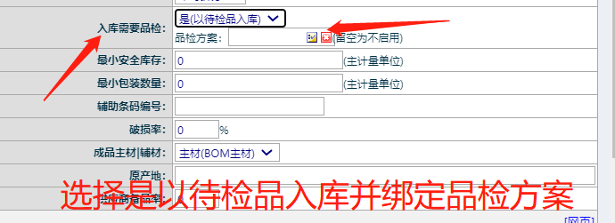 3. 选择“是以待检品入库”,并绑定品检方案 如下图: 4. 最后编辑保存。 点晴模切ERP更多信息:http://moqie.clicksun.cn,联系电话:4001861886 该文章在 2024/6/30 19:43:13 编辑过 |