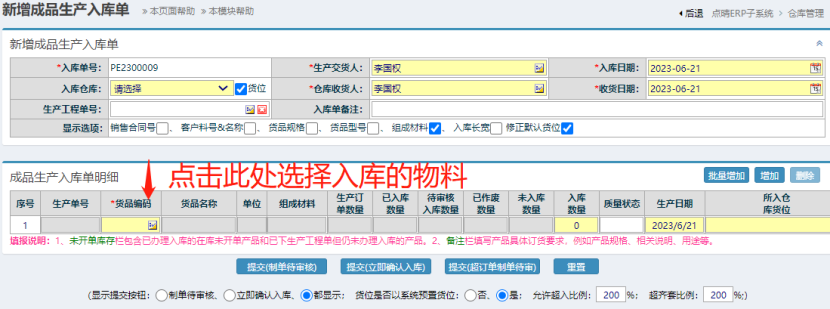 ![]() ![]() 1. 点击进入 如下图: ![]() 2. 点击货品编码选择入库的物料 如下图: ![]() ![]() 3. 选择完要入库的物料后,点击提交入库 如下图: ![]() 点晴模切ERP更多信息:http://moqie.clicksun.cn,联系电话:4001861886 该文章在 2025/9/25 15:40:18 编辑过 |