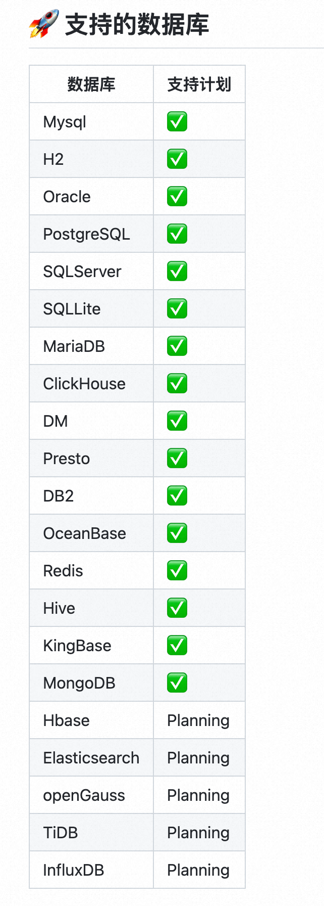 - 强大的扩展能力,目前已经支持Mysql、PostgreSQL、Oracle、SQLServer、ClickHouse、Oceanbase、H2、SQLite等等,未来会支持更多的数据库
