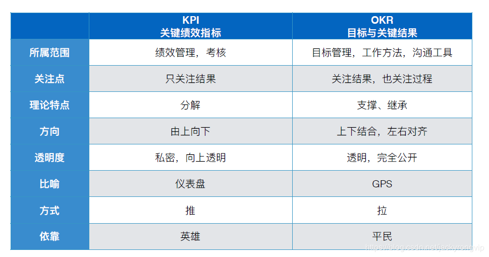关于OKR的高明之处,以及与KPI工具的差异,对比形式如下: