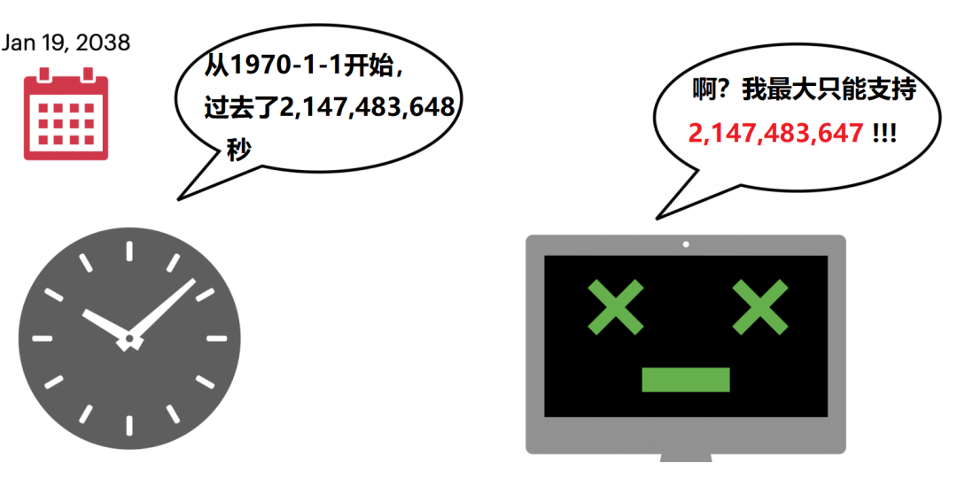Ken Thompson决定把这种方式成为Unix Epoch Time(Unix 纪元时间)。 用一个整数来表示时间戳,有几个主要的优势: (1) 简化 通过将日期和时间表示为一个单一的整数,可以大大简化日期和时间的计算。例如,计算两个日期之间的差异就只需要对两个整数进行减法运算。 (2) 便于存储和处理 整数易于存储(占用的空间较少)且便于在各种编程语言中处理。 (3) 兼容性 Unix时间戳可以在不同的操作系统和平台之间轻松地进行交换和比较。 (4) 全球统一 Unix时间戳是从同一时刻(1970年1月1日00:00:00 UTC)开始的,所以它提供了一种在全球范围内统一的时间表示方式。 ![]() 当然,Unix时间戳也有其限制。例如,它不能很好地处理闰秒,而且直接查看Unix时间戳并不能很好地理解当前的日期和时间。 在上世纪六七十年代,电脑主要还是16位的,Ken Thompson把Unix时间戳确定为32位整数,他觉得已经够大了,再说了谁会知道Unix操作系统能用多久呢? 让人想不到的是Unix一直存活了下来,它的很多概念对整个计算机科学和软件开发领域产生了深远的影响,包括时间和日期的处理方式。类Unix的开源操作系统Linux继承了Unix的衣钵,甚至统治了服务器端的OS市场。 开发Linux的时候,也是采用了32位的整数来记录时间戳。 现在一个大问题来了,32位的有符号整数最大值是2147483647 ,只能让我们用到2038年1月19号 03:14:07 UTC