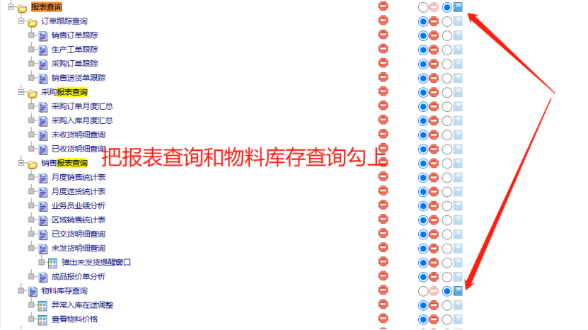 ![]() ![]() 1. 点击进入 如下图: ![]() 2. 选择对应的岗位赋权限 如下图: ![]() 3. 把报表查询和物料库存查询勾上 如下图:
