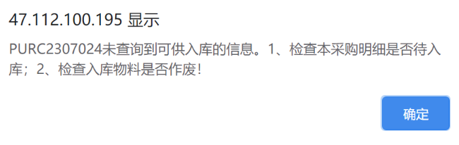 点晴模切ERP-弹出提示:未查询到可供入库的信息。1、检查本采购明细是否待入库;2、检查入库物料是否作废!