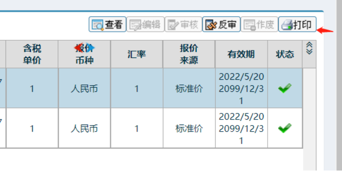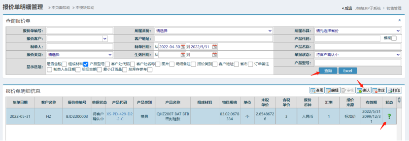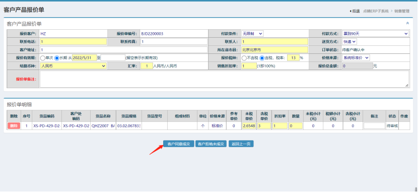 ![]() ![]() 1. 当报价单新建成功后,若客户同意这单的报价后,在”销售管理-->报价单管理-->报价单明细管理”,点击进入 ![]() 2. 在本页面查询出该客户的报价单,点击该条信息后,点击确认. ![]() 3. 然后在本页面点击”客户同意成交” ![]() 4.然后,在”报价单明细管理”的页面选中该条信息后点击”打印”,将该条报价单信息打印出下推给销售,生成销售单. ![]()