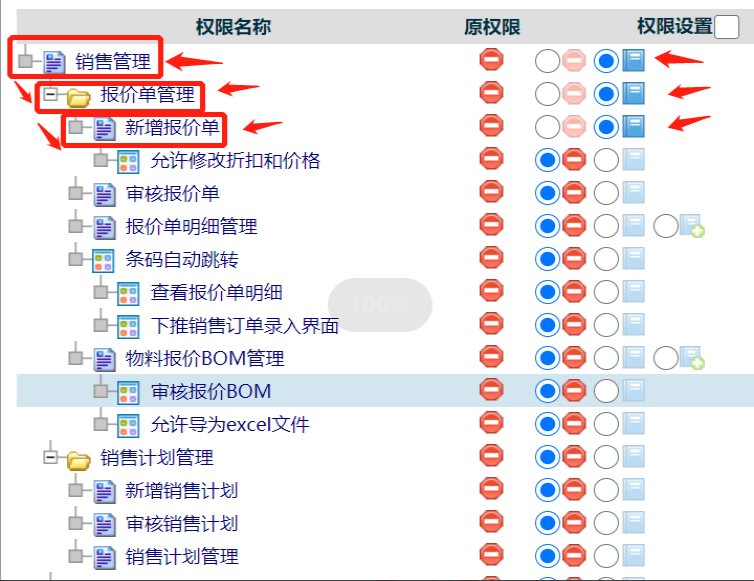 ![]() ![]() 1、在”系统管理-->用户管理-->用户权限维护”,点击进入 ![]() 2、按岗位来设置权限,首先选择某一位岗位 ![]() 3、 ![]() 补充说明:开放某一个权限时要把第一级大类的权限先开放,然后把第二级子类的也开放,最后把第三级子类开放,这样权限分配后才能起效。 例子:如分配新增报价单的权限,首先把“销售管理”这个第一级大类的权限点上, 然后再把“报价单管理”的权限也点上,最后把“新增报价单”的权限点上才能生效。 如下图: ![]() 4、选完后,点击更新权限即可 如下图: ![]() 5、也可以按用户来给开放权限,首先点击按用户设置权限 如下图: ![]() 6、然后选择部门,再选择用户,然后再开放权限,如之前的操作 如下图: ![]() 相关教程: