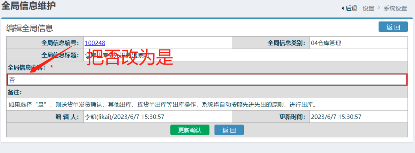 4. 把否改为是,然后点击更新确认 如下图: ![]()
