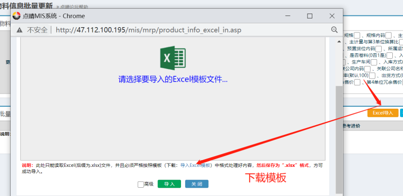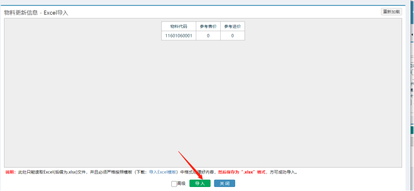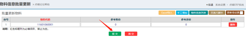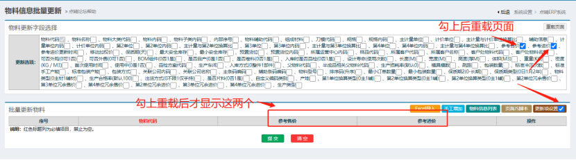 ![]() ![]() 点击进入 如下图: ![]() 勾上要更新的字段内容,然后再重载页面。 如下图: ![]() 然后下载EXCEL模板 如下图: ![]() 然后填写模板后,上传文件导入。 如下图: 最后点击提交即可。 如下图: ![]() 点晴模切ERP更多信息:http://moqie.clicksun.cn,联系电话:4001861886 该文章在 2023/8/4 17:33:11 编辑过 |