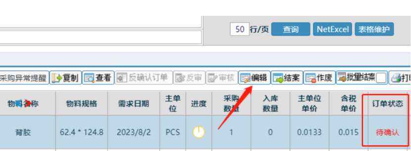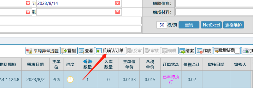 ![]() ![]() 情况描述:采购订单的信息错误了但已审核执行,需要反确认订单进行修改。 点击进入 如下图: ![]() 找到要修改的采购订单,点中后再点击反确认按钮。 如下图: ![]() 反确认操作完后,再点击查询一下该订单状态变为待确认。然后点中后再点编辑按钮进行修改。 如下图: ![]() 修改完后再点击编辑按钮保存即可 如下图: ![]() 最后重新进入审核流程。