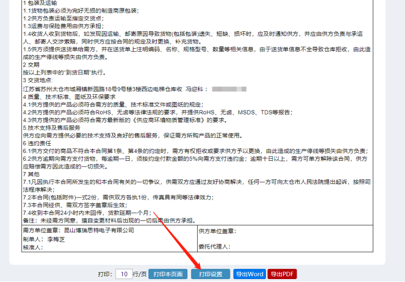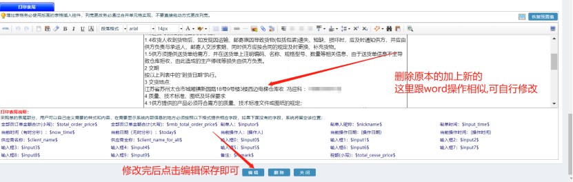 ![]() ![]() 点击打印设置 如下图: ![]() 进入页面找到需要修改的内容位置,进行修改。最后编辑保存即可。 如下图: ![]() 然后在打印页面刷新一下,即可看到效果。
