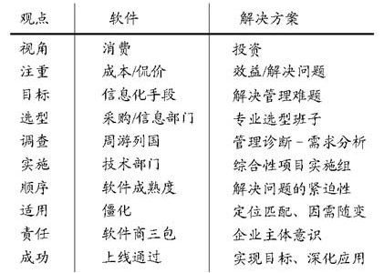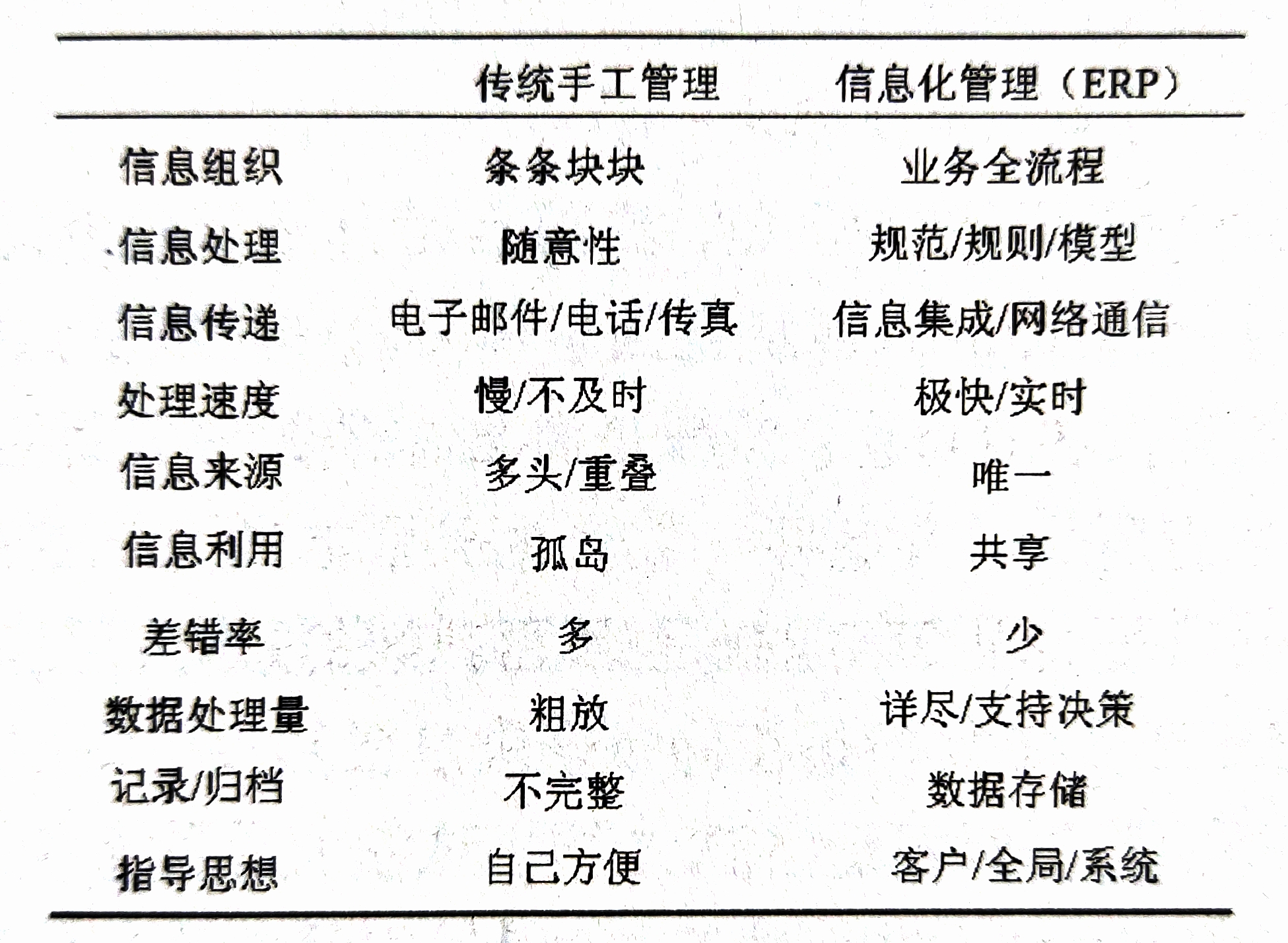 上世纪80年代初开始,经历了三十多年,我国ERP事业日趋成熟,形势喜人;ERP已经被公认为是制造业信息化的基础。但从总体来看,发展依然很不平衡,不同群体对ERP的理解和认知程度有很大差别,一些似是而非、模棱两可的论点,还在影响ERP事业的健康发展。针对一些不实的论点和实施方法上的偏差,怎样才能把ERP讲透,在业内取得一个比较接近一致的看法,是值得深思和共同努力的重大课题。 在诸多问题中,一个带根本性的问题就是处理好信息技术应用和管理业务之间的关系。“消除两张皮”已经呼吁了十几年,但是在许多企业里依然没有彻底解决;突出的表现就是企业的CIO和CEO缺乏沟通和共同语言,反映了对ERP实质理解存在严重差异。 国家提出信息化与工业化融合的战略口号,是不是就含有技术与业务密切结合的意思?这个战略如果具体落实到ERP系统,我的理解是:用ERP系统解决用手工管理难以解决的业务问题;反过来,企业管理不断创新发展的需求又推动ERP内涵不断充实与扩展。 这里提出了10个影响ERP成败、带有“分水岭”性质的观点,愿与业内人士共同探讨,引起关注,取得共识。这10个观点是: 1、信息化管理和手工管理是完全不同的两种管理模式 2、ERP的实质是解决方案,不是单纯的软件 3、ERP是覆盖企业业务全流程的信息化管理系统 4、ERP的管理指导思想 5、实施ERP必须具备的企业文化 6、实施ERP的动力是“我要干” 7、坚持企业主体意识和从管理需求出发 8、“一把手(高层管理团队)工程”是ERP成败的决定因素 9、信息化规划必须支持企业的经营战略 10、成功实施ERP的规范流程--知理-知己-知彼-知用 所谓纲举目张,首先要正确理解ERP的实质,认识问题解决了,其他问题就可以迎刃而解。下面谈谈我的理解。 1.信息化管理和手工管理是完全不同的两种管理模式 信息化管理决不是手工管理的翻版,它们是两种不同的管理模式;它们之间的区别可以用下表说明。 正因为管理模式不同,说明信息化管理是在做一件“过去从来没有这样干过的事”,只有当传统模式解决不了问题才需要信息化。因此,实施ERP必然是一种管理创新和改革。换句话说,没有改革的决心,就无法实施ERP。 借助信息技术的支持,信息化管理(如ERP)具备许多手工管理无法做到的功能特点,可以从9方面概括,即:规范、透明、共享、快速、细化、惟一、模拟、警示、强化。 简要说明如下。 实现这9个字所取得的效果像“规范流程”、“掌控全局”,“快速响应”、“实时分析”、“决策有据”、“预警提示”等等,都是企业高层管理团队梦寐以求的理想境界,而且是传统手工管理难以做到的。就是说:信息化管理要做手工管理做不到的事,而不是照搬手工管理模式 如果有的企业“自我感觉良好”,以为现有的管理模式完全可以满足企业生存与发展的需要,那么,也就没有必要投资ERP或搞信息化。应当看到,在全球剧烈竞争的形势下,企业如果没有危机感和紧迫感,不实现信息化(尤其当竞争对手都已实现了信息化),就像联想公司总裁柳传志说的:“只能是等死”。在全球竞争的严峻形势下,只有时刻保持“居安思危”的意识,才能应对任何突发的危机,不致在危机面前手足无措。