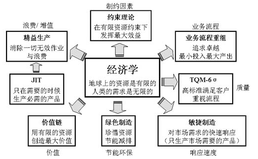 综上所述,用一句话来说:ERP可以理解为一种借助最新信息技术,以软件为载体,规范、集成、控制和优化企业内外业务流程的解决方案,解决手工管理解决不了的问题。而“业务流程”、“信息集成”、“创新改革”、“解决方案”和“协同运作”是ERP的5个主要的关键词。 4.ERP的管理指导思想 ERP的原理不是凭空诞生,而是融入各种现代管理理念之后形成的。管理信息化决不是单纯的技术问题,没有这些在工业化发展基础上创建的管理理论,不可能出现ERP。 ERP之所以称为“企业资源计划”,是基于现代经济学研究的基本课题,大体的意思是:“地球上的资源是有限的,如何合理利用有限的资源满足日益增长的人类需求,做到供需平衡,并进行合理的分配”。所有与ERP相关的管理理念,如果仔细分析,无非是从不同的角度来实现近代经济学研究提出的课题目标。见下图。