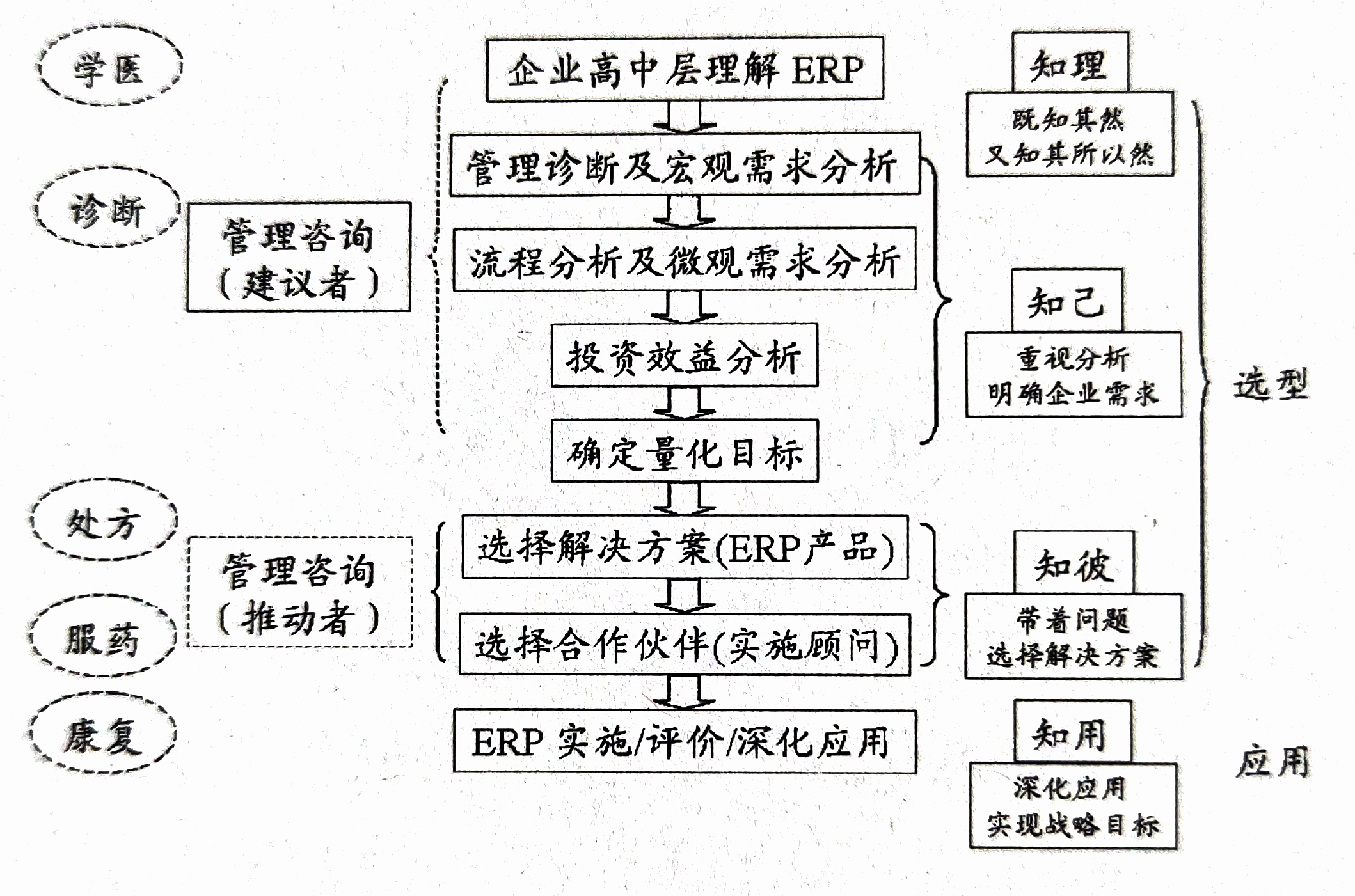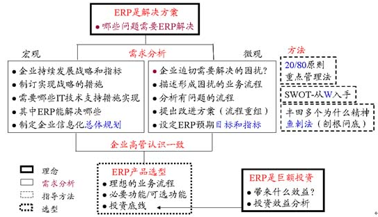 6.实施ERP的动力是“我要干” 如果明白了上述几节的论点,就不难理解什么是正确实施ERP的动因了。正确的动机只能是为了“解决手工管理解决不了的问题”。 人们常用“工欲善其事,必先利其器”来描述信息化,这是不错的,信息技术就是一种工具。但是人们往往忽视了这句话的前两个字,就是“工”和“欲”。 这里“工”就是管理者和员工,“欲”就是管理者有把管理搞上去、实现企业的战略愿景,提高企业竞争力的强烈欲望,简言之,“工欲”就是“我要干”。如果企业的管理者和全体员工没有改进管理的欲望,再好的ERP产品也不可能发挥作用。因此,千万不能忽视这个“工”字,也就是“人的因素”。 ![]() 国内企业上ERP有各种动因,其中不少虽然有正确的动机,但是缺少量化的目标,最后很难衡量和判断实施的效果,也就是没有成败的量化标准。有一些企业上ERP是完全被动的,如完成上级主管部门下达的信息化指标、同行业之间攀比、面子工程或形象工程、受IT部门从单纯技术层面上的鼓噪拱动等。“动机不正”,埋下了失败的种子,使大量资金和人力打了水漂。 各种动因归纳起来,无非是:“我要干”和“要我干”两大类,因此,首先要弄清楚“为什么要上ERP,上ERP想解决什么问题”? 要使每一位员工对实施ERP都有“我要干”的迫切感,就要以实现企业战略目标为全体员工的行动纲领。从上到下逐层分解,制订各个部门和岗位的业绩考核指标(KPI),形成各级工作的“方向标”,使每一位员工都为实现企业的经营战略、朝着同一个方向努力奋斗,掀起“我要干”的热潮,员工将自愿地把ERP当成一种解脱管理困境的良方,在创新实践中,改变企业文化,也提高了自身的素质。 因此,实施ERP的动力只能而且必须由企业高层发动和倡导。 7.坚持企业主体意识和从管理需求出发 正因为是“我要干”,所以必须坚持“企业主体意识”,企业要任命得力的项目经理、选配精干的业务骨干组织项目实施组,从进行管理诊断和需求分析开始,到项目实现目标并验收结束,勇挑重任,负责到底。 实施ERP必须从分析企业的管理问题入手,也就是“管理诊断”。从全球竞争的战略高度,以竞争对手为对比标杆,审视企业的劣势和弱点,找出存在问题的根因(因果分析),设计理想的解决办法和业务流程;在此基础上做出信息化的需求分析,并明确目的,制订量化指标和评价标准,作为ERP产品选型和最后验收的依据。 必要时,可选择熟悉企业所在行业、有成功业绩的咨询顾问公司和专家顾问,作为实施方合作伙伴。在几方共同努力下,实现企业预期的目标。 强调需求分析之前必须做管理诊断和因果分析,是因为各种管理问题并不一定都是通过实施ERP能够解决的,那种以为“上了ERP什么问题都解决了”是一种极大的误解,ERP并不是万能的。比如说产品成本高、质量差是由于加工工艺落后造成的,那么就需要把资金投向更新设备和技术改造,而不是上ERP;如果企业的问题是没有稳定的市场,也不是上ERP就能完全解决的。换言之,改进管理就像看病一样,必须找准“病因”对症下药。 需求分析的逻辑图如下: 8. “一把手(高层管理团队)工程”是ERP成败的决定因素 所有失败的案例,尽管理由多多,但是都有共同的一条就是:“得不到管理高层的支持”。ERP项目要想取得成功,必须坚持“一把手工程”,这是国内外在长期实践中得出的一致结论。这个问题虽然在不断地反复强调,但时至今日,还没有被所有的企业管理高层理解,说明我国真正理解ERP的高管还不是很多,这是影响我国实施ERP系统前进步伐的一个严重的障碍,因此,在企业高管中普及ERP的基础知识是一项迫切需要解决的问题。 “一把手工程”是一个本土化了的形象化提法,强调了企业一把手的责任和作用。英文的原意是“管理高层承诺(top management commitment)”,指的是“管理高层团队”对项目的倡导和责任,是团队而不是某个人。当我们用“一把手”称谓时,必须理解其实质的含义。 为什么必须是“一把手工程”?可以从两方面理解。 实施ERP的正确动因是为了支持企业经营战略的实现,这是企业管理高层团队的需要。有了ERP系统,“一把手”走遍天涯海角,只要有上网的地方,都可以随时掌控企业的运营情况,有偏差及时纠正,有机遇绝不放过;有完整详尽的数据依据,减少决策失误。所以说,ERP成功实施后最大的受益者正是“一把手”。 要获益就得付出,英文里常说“no pain, no gain(原意是:没有艰苦的付出,就不会有收获)”,实施ERP必须深化管理改革,诸如在重组业务流程、调整组织机构、对员工的培训与岗位调配、协调部门间利益、完善业务规则、建立有利于提高生产力的激励机制和考评体系等等,都会遇到各种阻力。这些阻力只有“一把手”亲自出面拍板定夺,才能排除。 因此“一把手”对ERP项目的成败有不可推卸的责任。 正因为“一把手”是实施ERP最大受益者和第一责任人,顺理成章,ERP项目必然是“一把手工程”。 要成为受益者和责任人,“一把手”必须是明白人,而且要亲自用。 一把手只有是“明白人”,才能明辨是非、正确指导,坚持改革,积极推动,成为ERP项目成败的责任者。只有“自己用”,ERP项目的效益才能充分发挥,并不断提出更高的新需求,促使企业信息化不断深入发展,体现职业经理人的业绩,成为ERP项目最大的受益者。在讨论“深化应用