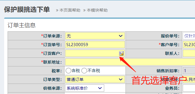 ![]() ![]() 1.点击进入 如下图: ![]() 2.首先选择客户,点击黄色框。(带*号属于必填项) 如下图: