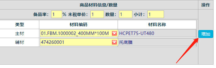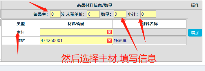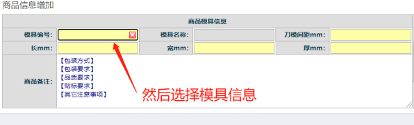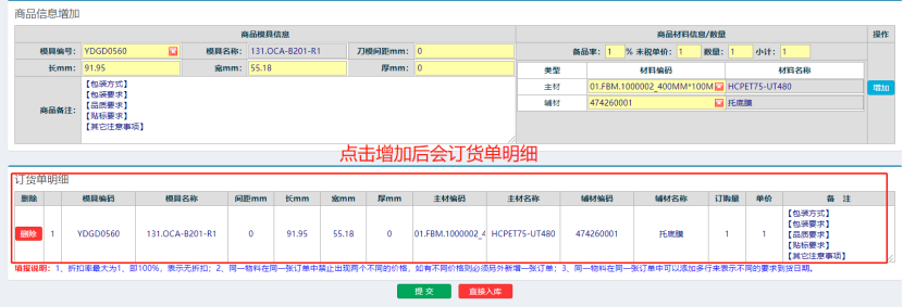 4.接着选择模具信息,跟上面选客户的操作一致 如下图: ![]() 5.接着选择主材,填写信息。 如下图: ![]() 6.以上信息都有之后,点击增加 如下图: ![]() 7.点击增加后会有订货单明细。 如下图: ![]() 8. 如果有多个产品,重复4-6的操作即可。
