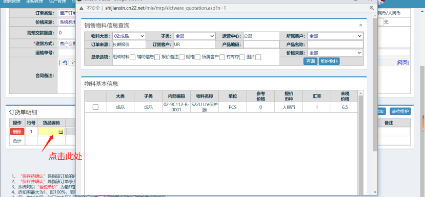 点击货品编码下方的黄色框,在弹出的窗口选择客户要的货品 如下图: