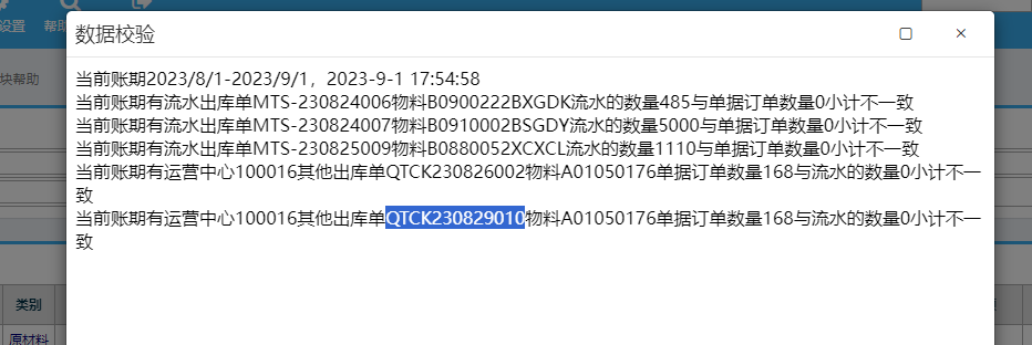 ![]() ![]() 出现本提醒,一般是没有做当月的月度结存就直接校验数据造成的。因为本月有作废的单据会造成单据的数量与流水的数据不符。