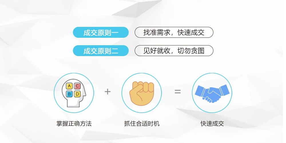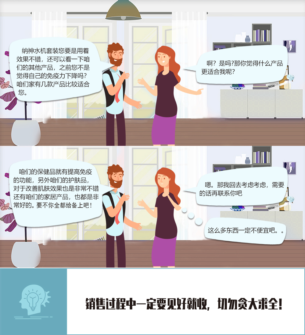 ![]() ![]() ![]() 导读 小然相信大家一定遇到过这样的情况:我们的产品符合了顾客的需求,也让顾客产生了兴趣,但最终却没有成交。 这一定是顾客的问题?NONONO!问题很有可能出在你的身上哦。 今天,小然分享给家人们两条成交时需要遵循的原则,如果没有掌握,很可能让最后的结果变得“很不愉快”呢。 定义 促进成交的定义和目标 首先,我们先来了解一下什么是“促进成交” 销售流程中的“促进成交”,是在顾客产生需求后,营销人员根据顾客发出的购买信号主动提出成交要求,及时引导和解决顾客提出的各类异议,从而完成现场成交或达成成交的意向。其中包含了以下任务:判断顾客的购买信号、提出成交要求、处理异议以及维系、提升人际关系。 在销售流程中,促进成交可以比喻为“临门一脚”。但这“临门一脚”也需要我们安然销售人员有坚实的基础和前提,以及需要遵循成交的原则。 促进成交的原则 找准需求 自然成交 作为民族直销企业,安然销售的发力模型是和传统店铺不同的。 与传统销售的发力点在促进成交这一环节不同,安然销售发力模型的发力点是发展信任、激发需求这两个部分,只要做好这两点,在和客户的长期交往中取得信任,并针对顾客的需求进行有效激发,那么成交就是水到渠成的了。 并且如果依照这样的方式进行销售,就不存在强迫顾客成交而破坏或透支信任关系。 ![]() 试想一下,如果在销售过程中为了促进成交,采用了不合时宜、不讲技巧的成交方法,是不是会增加顾客的购买压力呢?如果没有有效疏导顾客的购买压力,就会很快转化为“拒绝”,而使成交的机会之门被提前关闭。 ![]() 见好就收,而非贪大求全 在成交过程里,如果顾客已经产生了购买信号,我们需要抓住机会尽量快速成交,在顾客购买意向的最高点做出成交行为,让销售过程简单、迅速。 在销售流程中,随时都可能完成成交。当顾客的购买信号出现时,就可以及时提出成交要求。如果错过了顾客下定决心的时机,成交就变得困难了。同时记得不要贪大求全,产品销售是长期的、持续的,不要试图一次解决顾客全部的问题,给顾客推荐过多的产品。 ![]() 总结来看,只有掌握正确的成交原则,把握好成交时机,并选择正确的成交方法,才能最终促成销售! ![]() 以上就是小然分享给家人们的促进成交的两大原则,快理解掌握,让顾客愉快的、自然而然的接受我们的产品吧! 人划线 该文章在 2023/10/10 12:12:43 编辑过 |