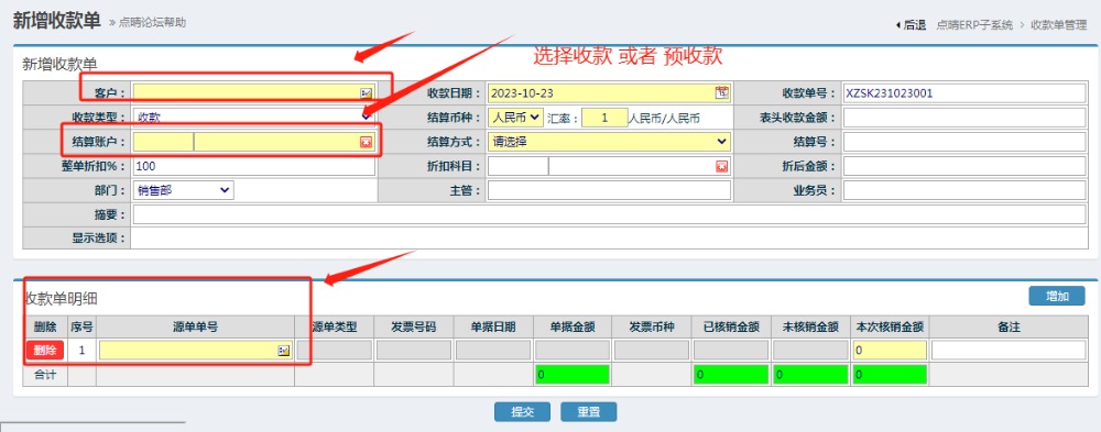 ![]() ![]() 新增收款单的前提是需要有销售发票对应的应收款。 如果没有应收款收到了客户的款项,是需要填制预收款单。